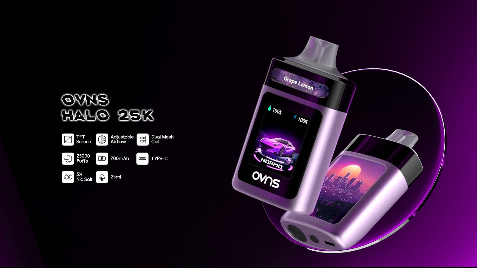 Command every aspect of your vape with the OVNS HALO’s TFT touch screen, enabling seamless adjustments to three precise wattage levels/modes (15W Normo / 20W Boost / 25W Beast) and customizable airflow for tailored cloud density. This powerhouse pairs dual mesh coils with a massive 25mL e-liquid capacity and 850mAh Type-C rechargeable battery to deliver up to 30,000 puffs of consistent flavor. Instantly toggle between smooth MTL draws and intense DTL clouds via intuitive touch controls, while monitoring real-time battery and liquid stats.
