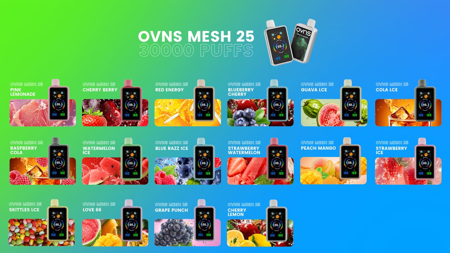 OVNS MESH 25 delivers an industry-leading up to 30,000 puffs from its massive 25mL pre-filled e-liquid (5% nicotine). Standout features include precise adjustable wattage and adjustable airflow, allowing you to fine-tune vapor production, flavor intensity, and draw resistance to perfection.