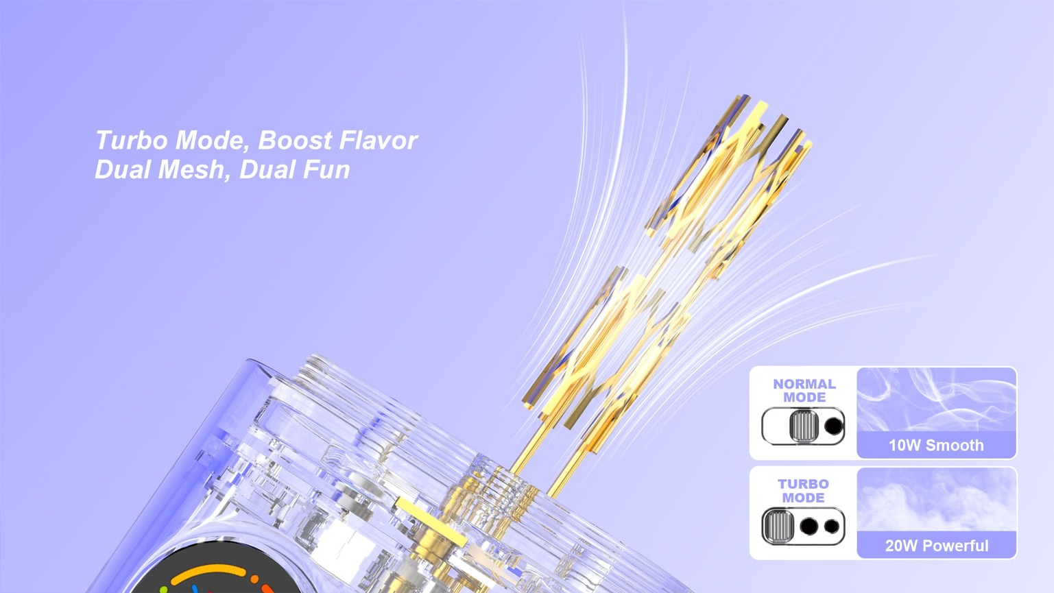 Modes adjustable: Tur(6000 puffs, 21w powerful) and Nor MODE(12000 PUFFS, 10w, smooth)