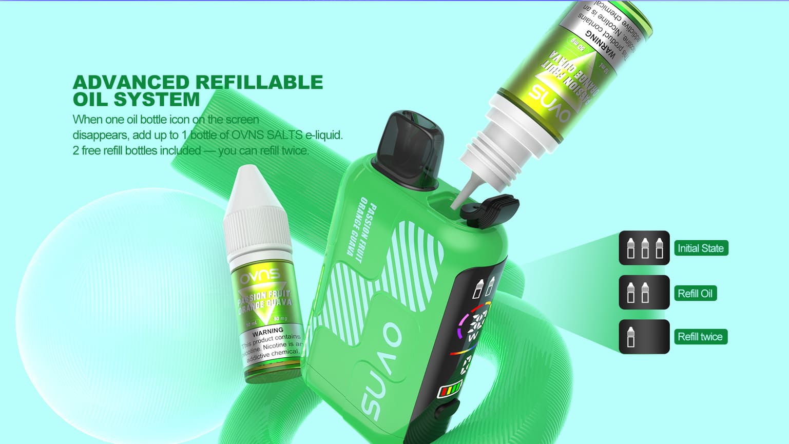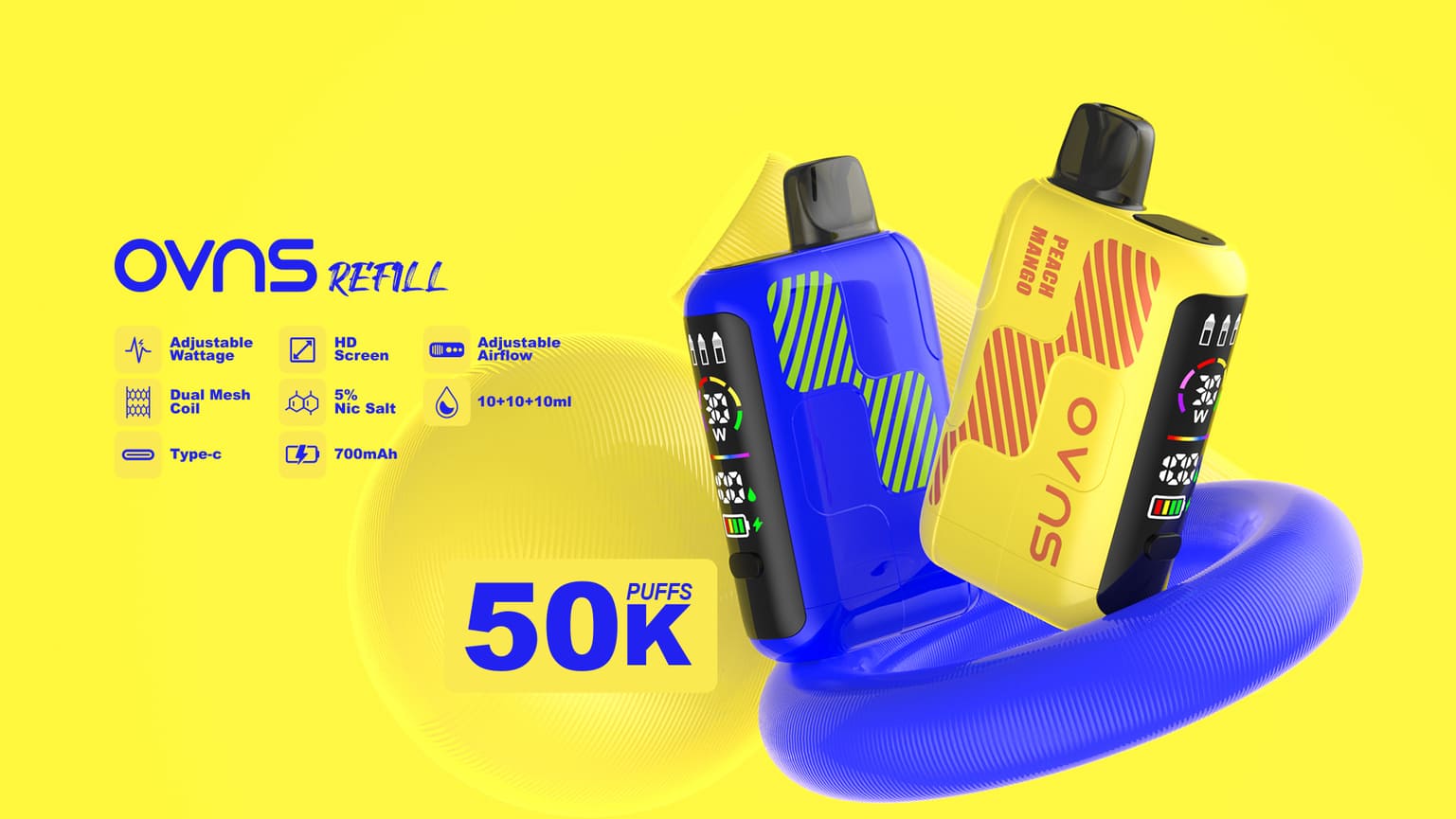 Meet the OVNS REFILL: the ultimate refillable disposable vape engineered for economy and performance. This innovative system includes 30mL of e-liquid (pre-installed 10mL + 2x 10mL refill bottles), allowing two manual refills to achieve 50,000 puffs – all in one device. The dual mesh coil delivers rich, consistent flavor, while the device enables wattage adjustment and airflow customization. Its 700mAh battery (Type-C rechargeable) supports long-term use, eliminating single-device waste. Simply refill via the designated port when empty – no complex pods or tools required. Perfect for eco-aware vapers seeking premium features (adjustable power/airflow) and massive savings.